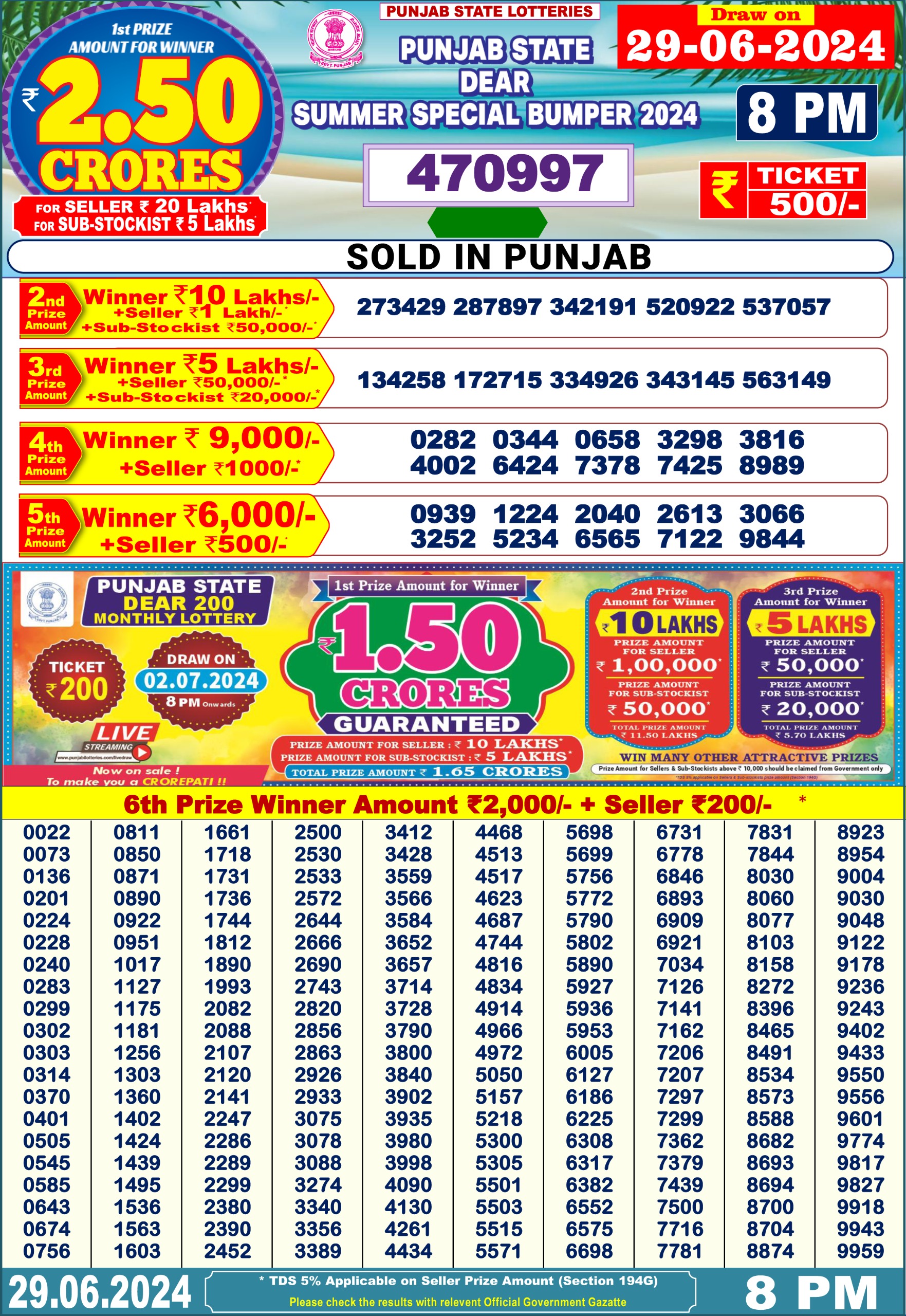 Punjab state dear lottery result summer special bumper 29-6-24