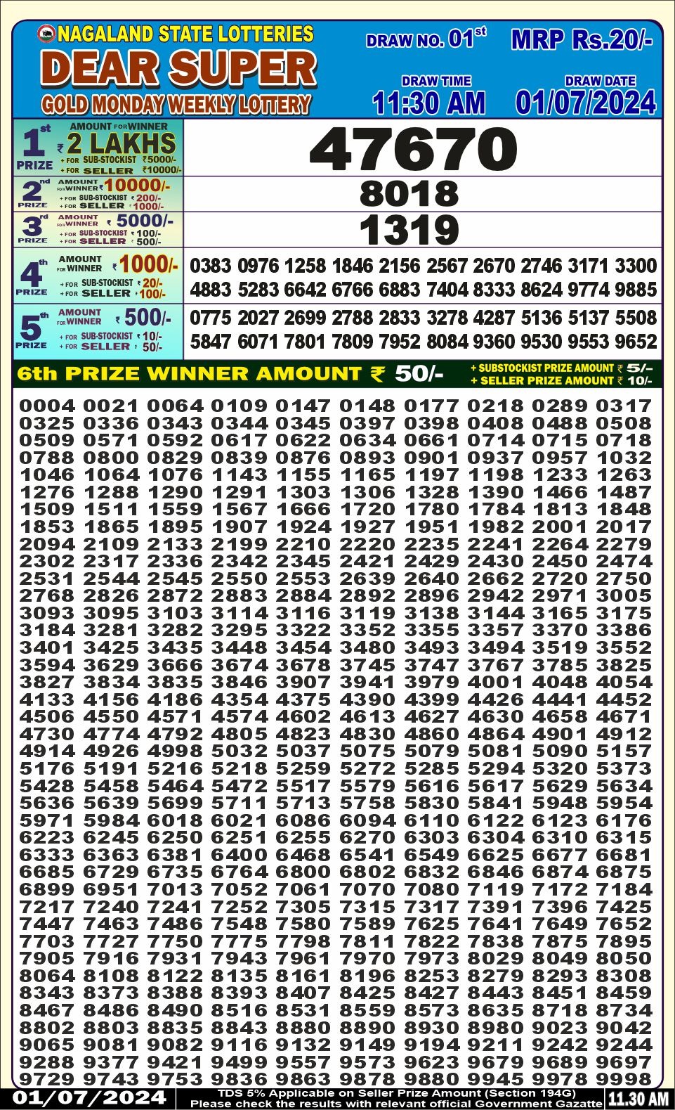 Dear super gold 11.30am lottery result 1-7-24