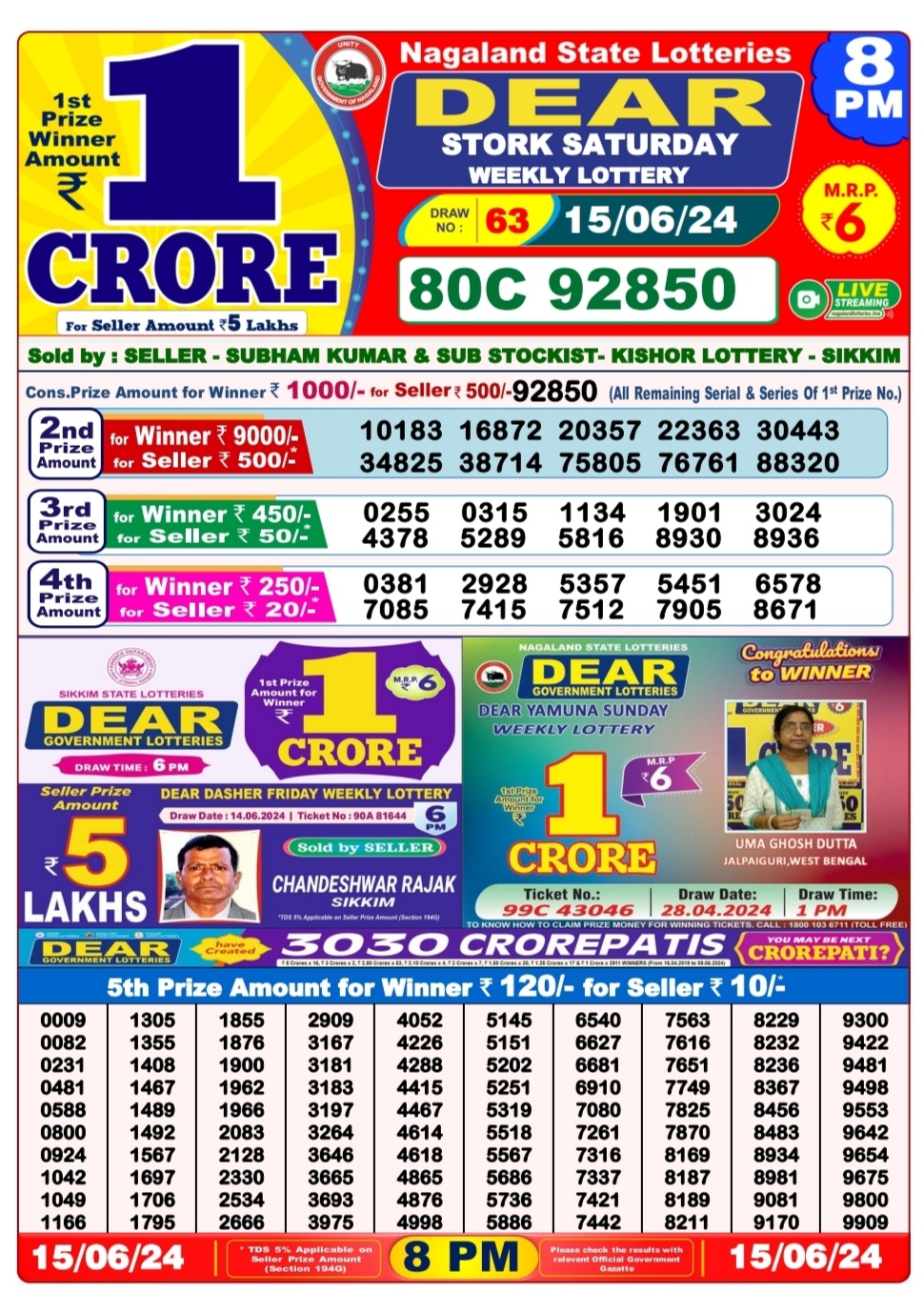 Dear 6pm lottery result 15-6-24