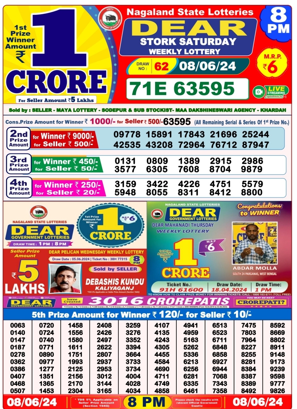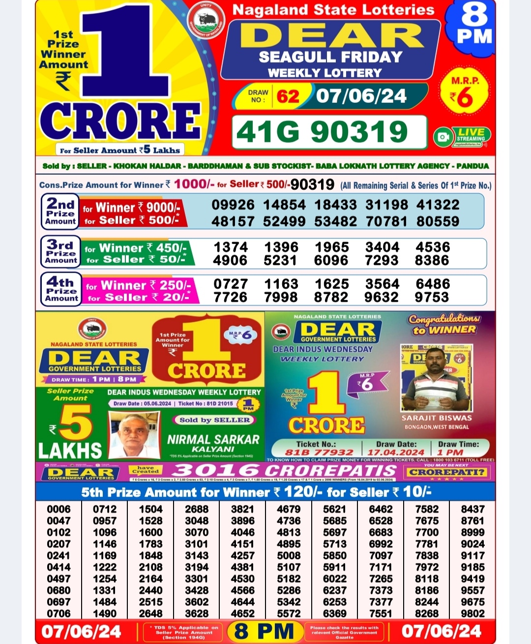 Dear Lottery Result Today 1 PM 6 PM 8 PM Lottery Sambad