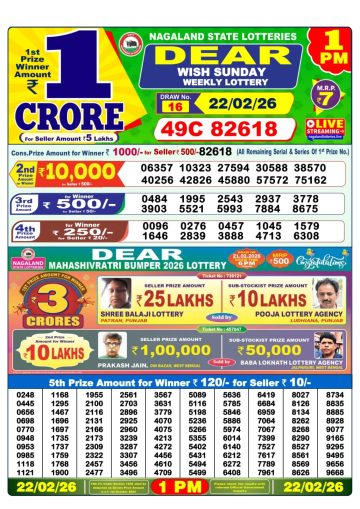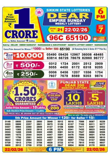 Dear Lottery Result 22.02.26 6PM Today Dear Day Result