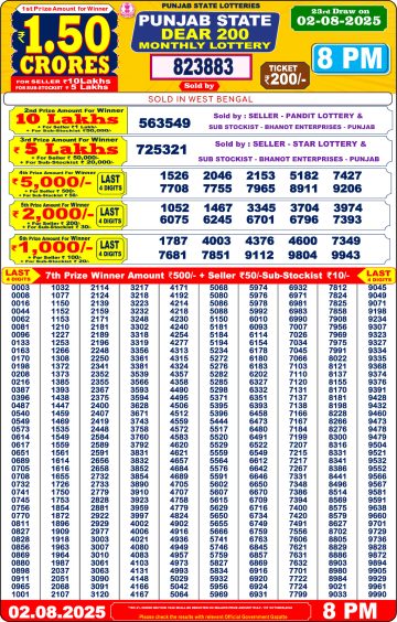 Punjab State Dear 200 Lottery Result Monthly 02.08.25