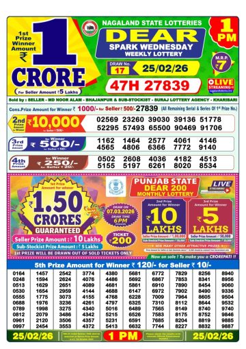 Dear Lottery Result 25.02.26 1PM Today Dear Morning