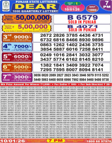 Punjab State Dear 1000 Quarterly 7 PM Lottery Result 10.01.26