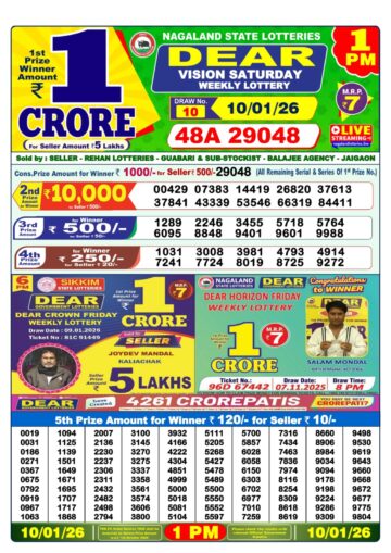 Dear Lottery Result 10.01.26 1PM Today Dear Morning
