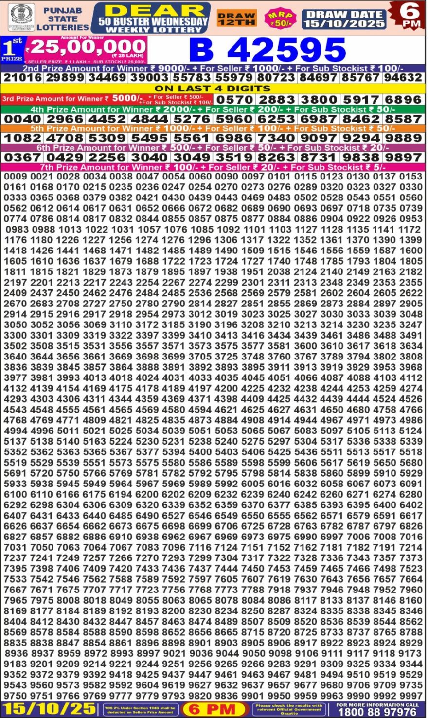 Punjab State Dear 50 6 PM Lottery Result 15.10.25 Share: XFacebookPinterestRedditVKDiggLinkedinMix Related Results 0 4 Punjab State Dear 50 6 PM Lottery Result 05.12.25 0 11 Punjab State Dear 50 6 PM Lottery Result 04.12.25 0 24 Punjab State Dear 50 6 PM Lottery Result 03.12.25 0 24 Punjab State Dear 50 6 PM Lottery Result 02.12.25