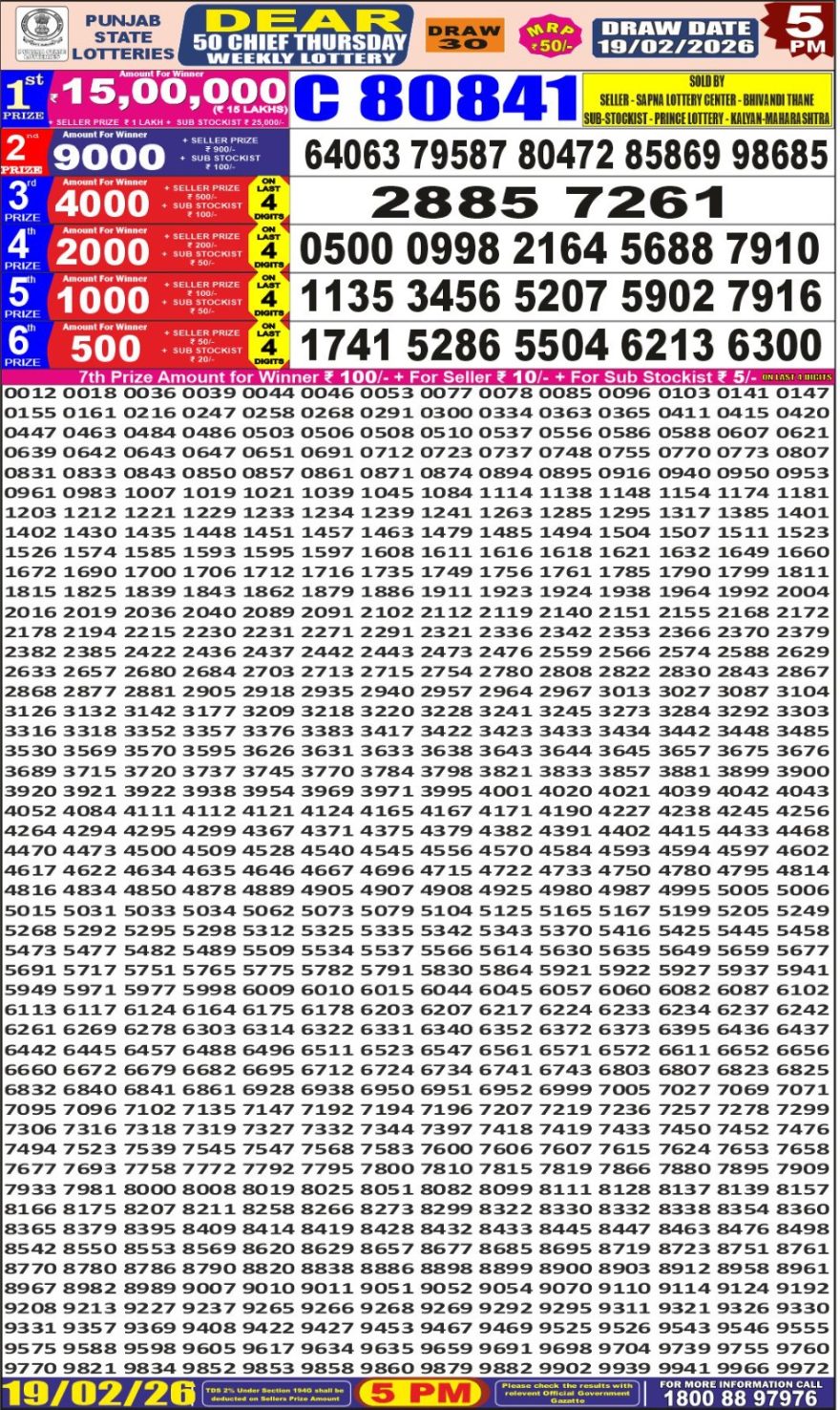 Punjab State Dear 50 5 PM Lottery Result 19.02.26 Share: XFacebookPinterestRedditVKDiggLinkedinMix Related Results 0 88 Punjab State Dear 50 5 PM Lottery Result 07.03.26 0 102 Punjab State Dear 50 5 PM Lottery Result 06.03.26 0 85 Punjab State Dear 50 5 PM Lottery Result 05.03.26 0 89 Punjab State Dear 50 5 PM Lottery Result 04.03.26