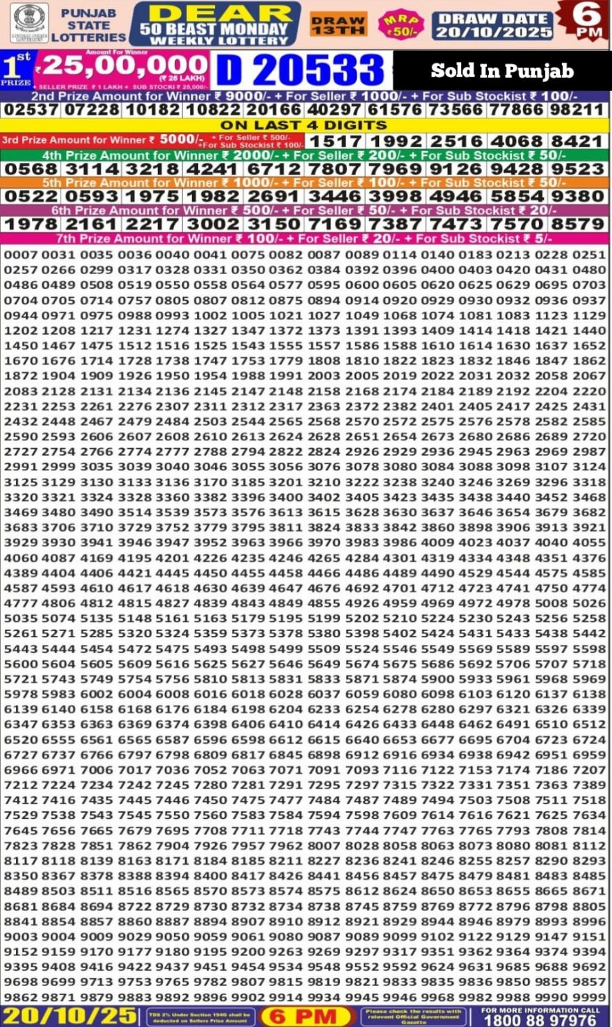 Punjab State Dear 50 6 PM Lottery Result 20.10.25 Share: XFacebookPinterestRedditVKDiggLinkedinMix Related Results 0 4 Punjab State Dear 50 6 PM Lottery Result 05.12.25 0 11 Punjab State Dear 50 6 PM Lottery Result 04.12.25 0 24 Punjab State Dear 50 6 PM Lottery Result 03.12.25 0 24 Punjab State Dear 50 6 PM Lottery Result 02.12.25
