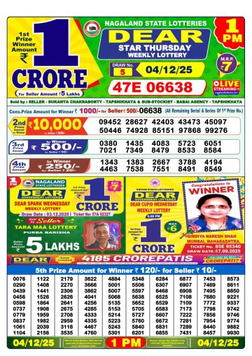 • Dear Lottery Result 05.12.25 6PM Today Dear Day Result