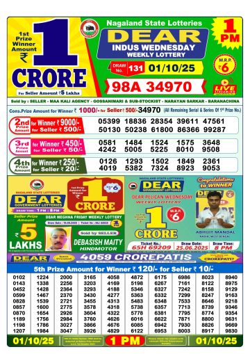 Dear Lottery Result 01.10.25 6PM Today Dear Day Result