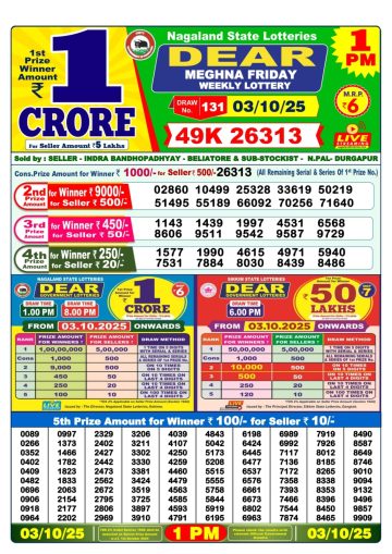 Dear Lottery Result 03.10.25 6PM Today Dear Day Result