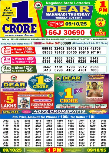 Dear Lottery Result 09.10.25 1PM Today Dear Morning