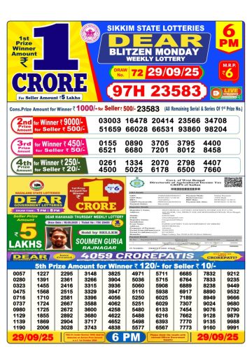 Dear Lottery Result 29.09.25 6PM Today Dear Day Result