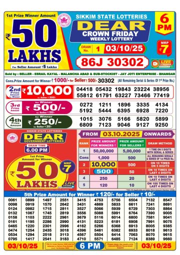 Dear Lottery Result 03.10.25 6PM Today Dear Day Result