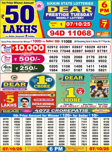 Dear Lottery Result 07.10.25 6PM Today Dear Day Result
