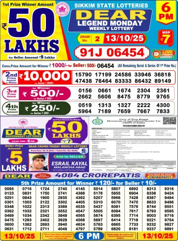 • Dear Lottery Result 13.10.25 6PM Today Dear Day Result
