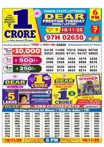 Dear Lottery Result 18.11.25 6PM Today Dear Day Result