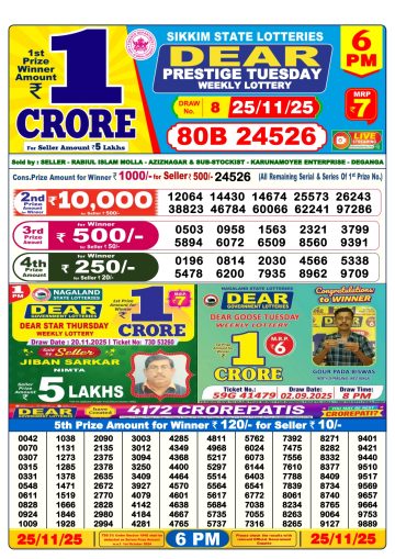 Dear Lottery Result 25.11.25 6PM Today Dear Day Result
