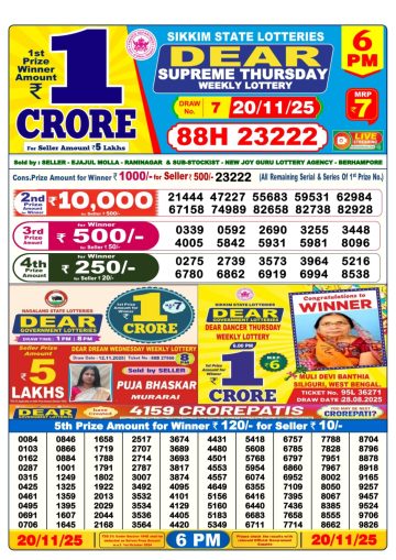 Dear Lottery Result 20.11.25 1PM Today Dear Morning