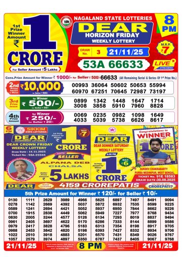 Dear Lottery Result 21.11.25 1PM Today Dear Morning