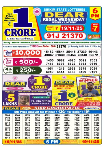 Dear Lottery Result 19.11.25 6PM Today Dear Day Result