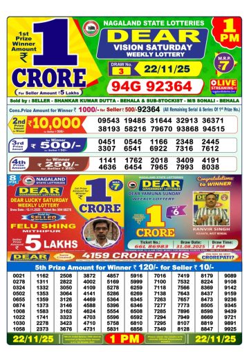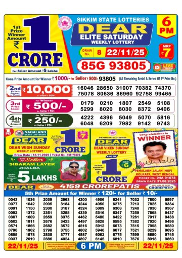 Dear Lottery Result 22.11.25 6PM Today Dear Day Result