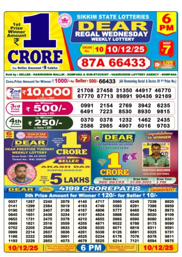Dear Lottery Result 10.12.25 6PM Today Dear Day Result