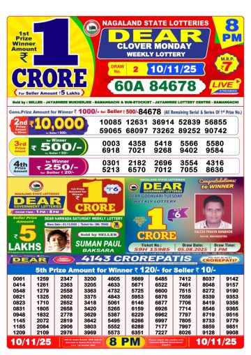 Dear Lottery Result 10.11.25 1PM Today Dear Morning